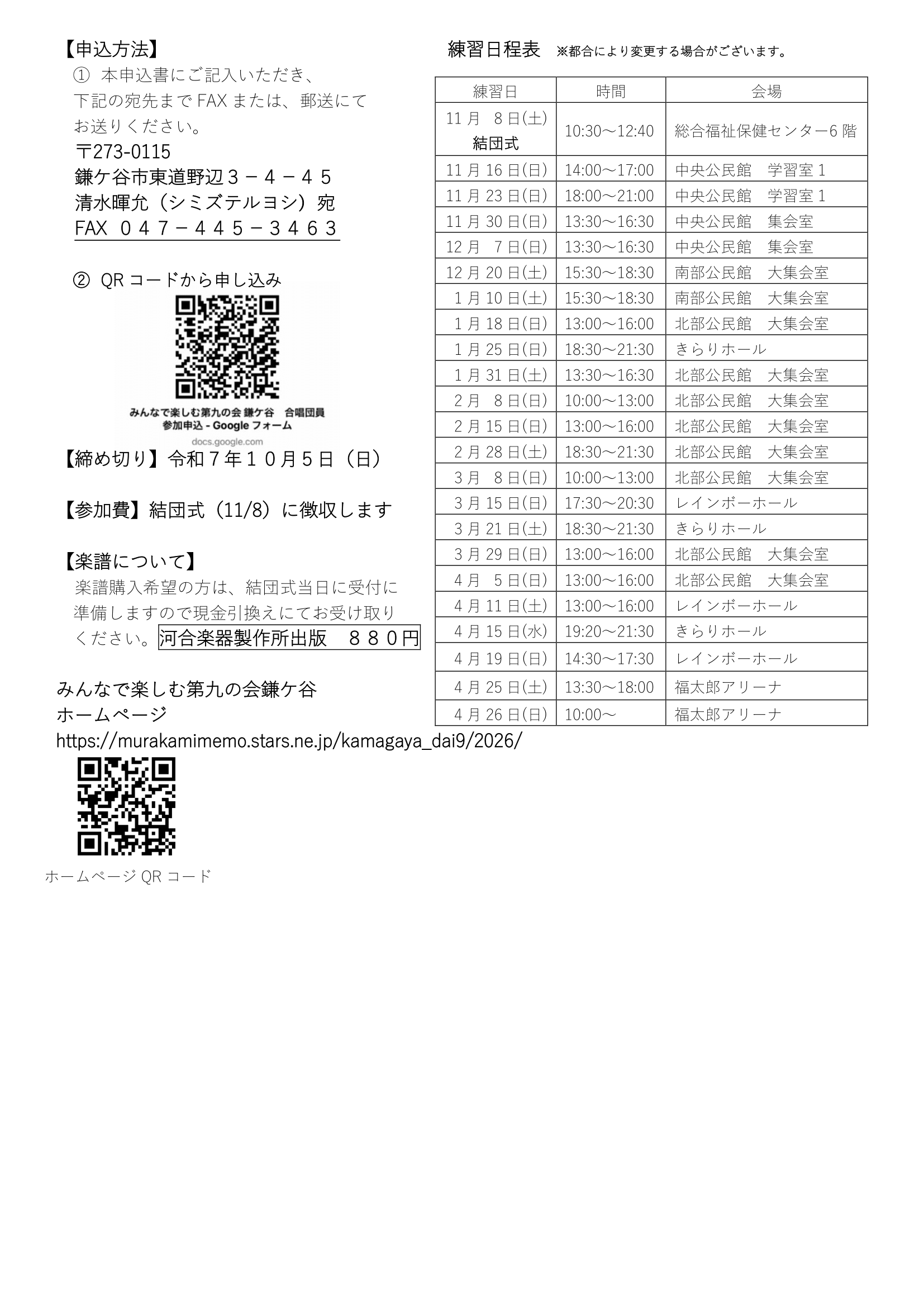 参加申込書に必要事項を記入の上、ファックス(047−445−3463)または郵送で、〒273-0115 鎌ケ谷市東道野辺3−4−45 清水 暉允 (しみずてるよし))宛てにお送りください。